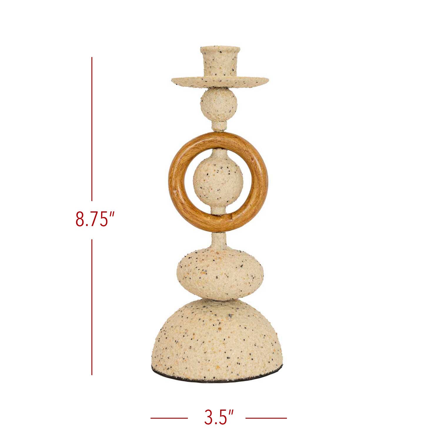 Bring an artful touch to your home with this sculptural taper candle holder, defined by its stacked geometric form and soft, textural finish. The creamy sandy tone with subtle black and brown speckles evokes an organic, earthy elegance that complements a variety of décor styles and color palettes. Crafted from durable metal, this piece blends functionality with design, serving as both a decorative accent and a candle holder.